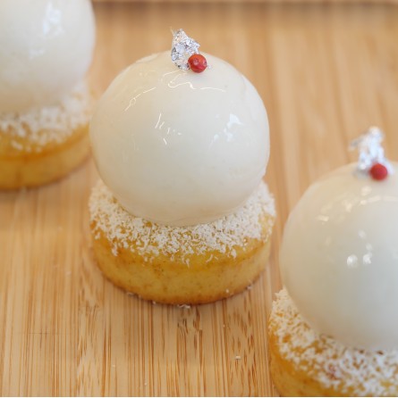 Reiches Vanille-Biskuit, Litschi-Mousse und Kern aus Quittenkompott (aus dem Garten, natürlich!).