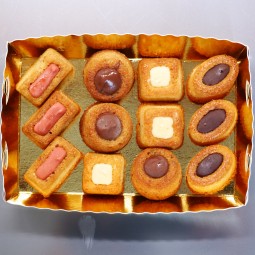 Eine bunte Mischung von luxuriösen Mandel-Butter-Eiweiß-Küchlein mit verschiedenen, teils...